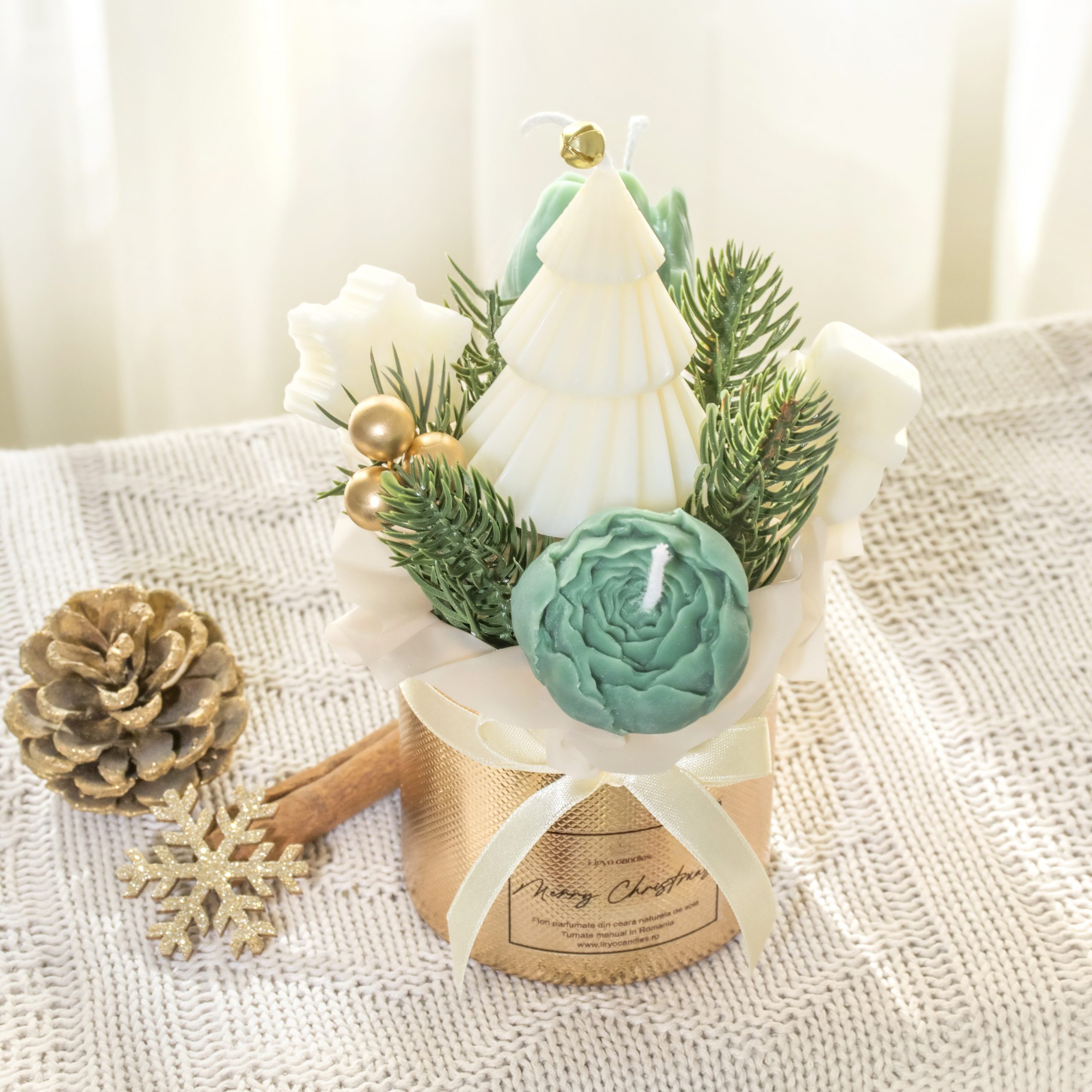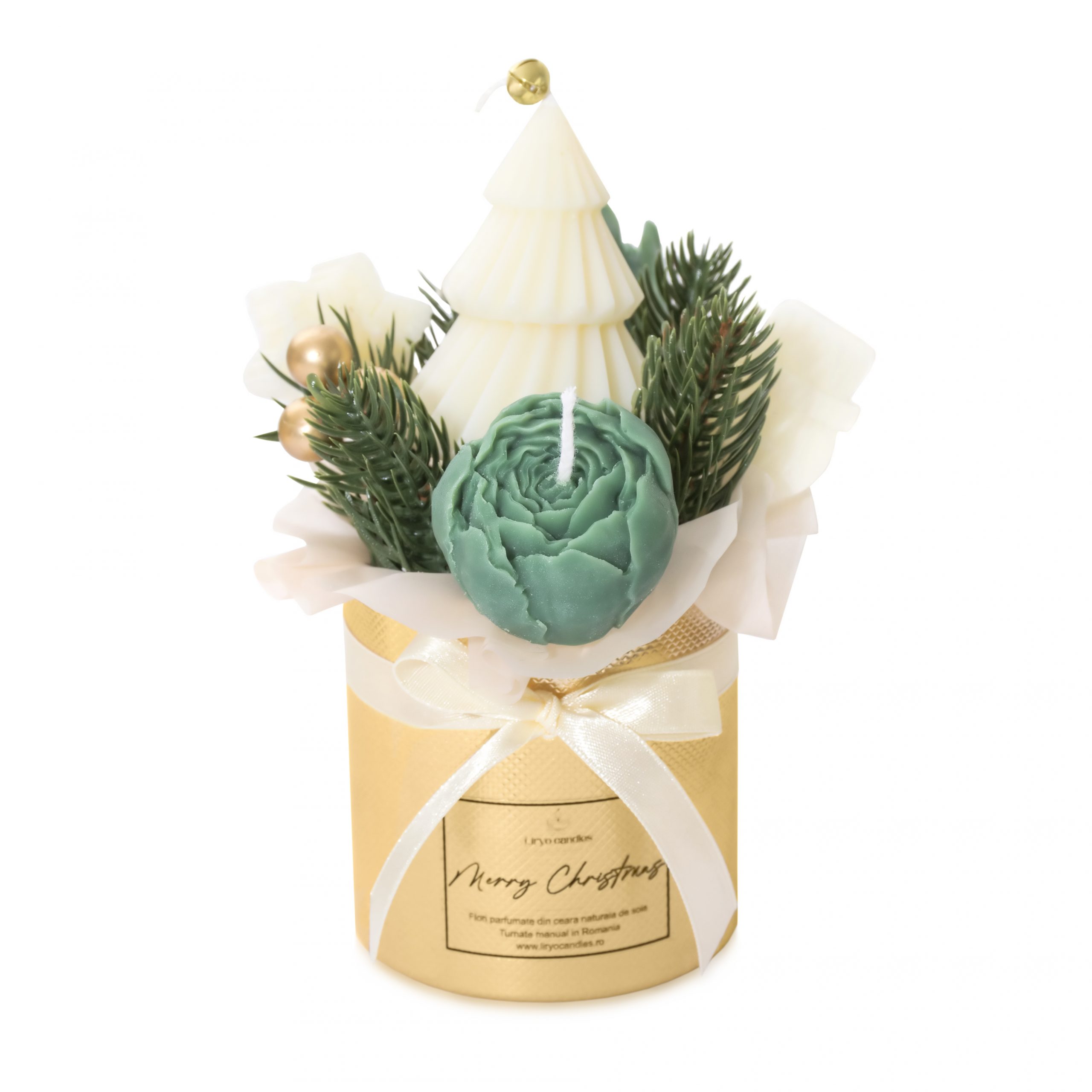 Fiecare aranjament contine 5 lumanari parfumate in forma de flori si ornamente specifice craciunului din ceara de soia.