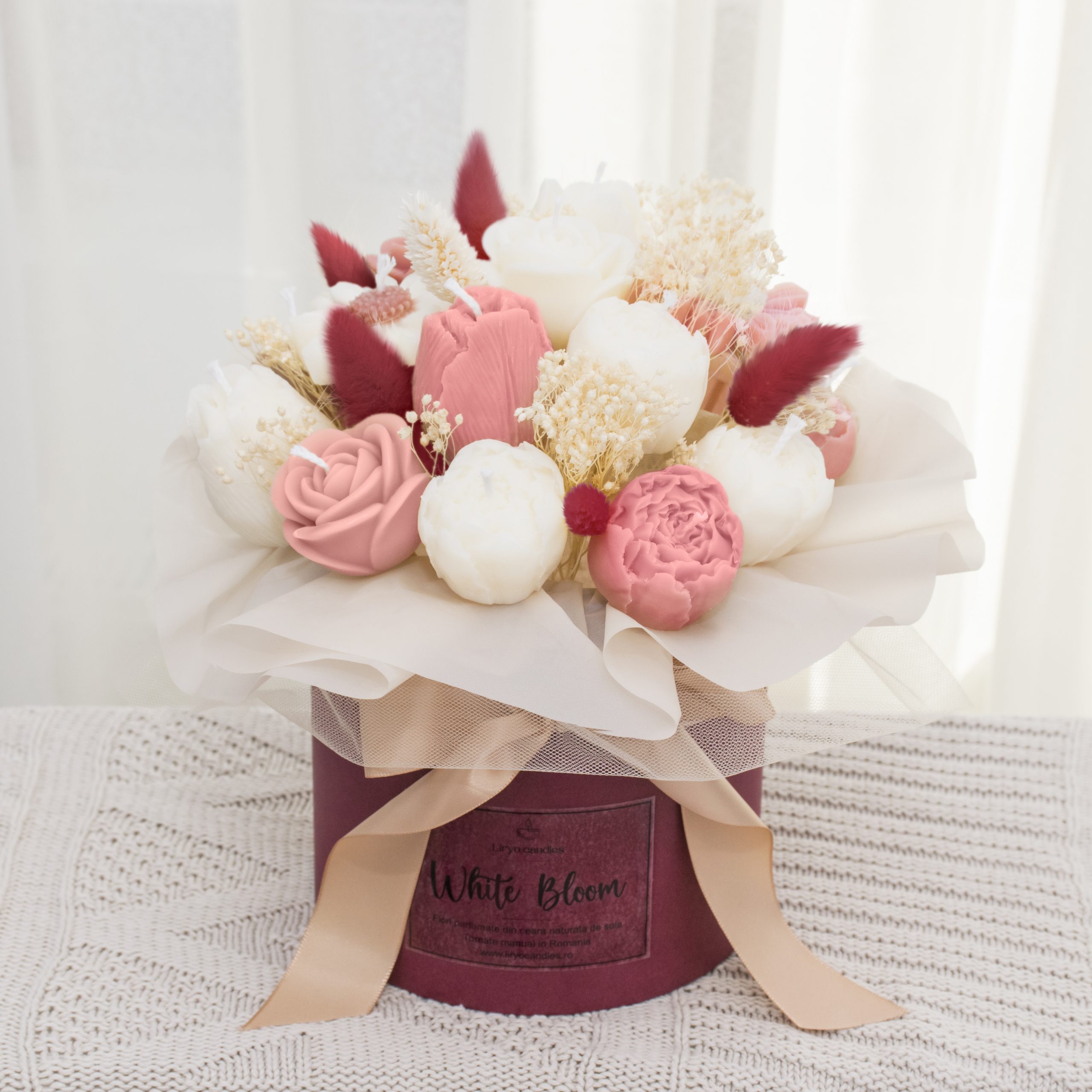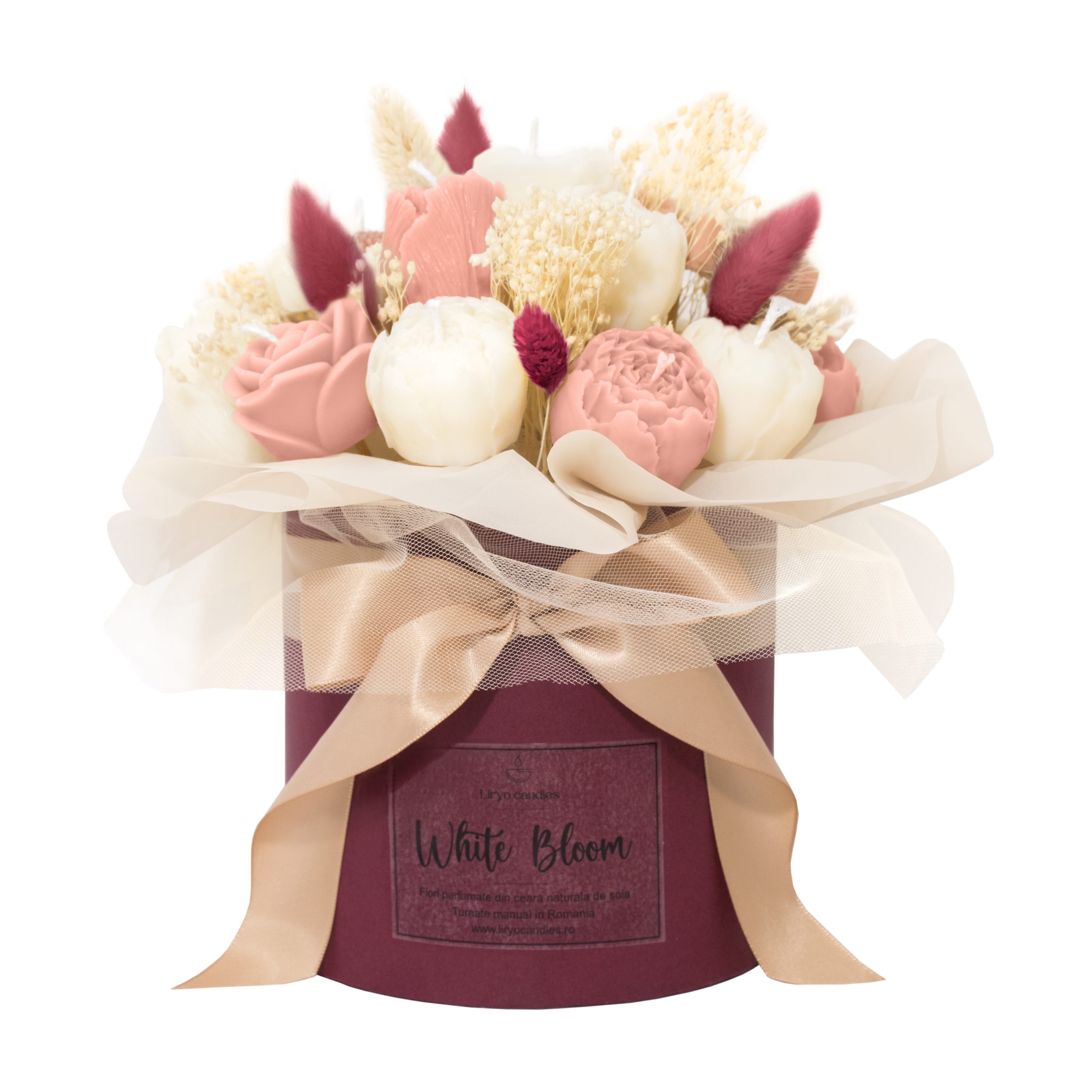 Elegant si rafinat, acest aranjament floral este realizat manual din ceara naturala de soia, plante uscate si lumanari parfumate, fiind un cadou deosebit pentru orice ocazie.